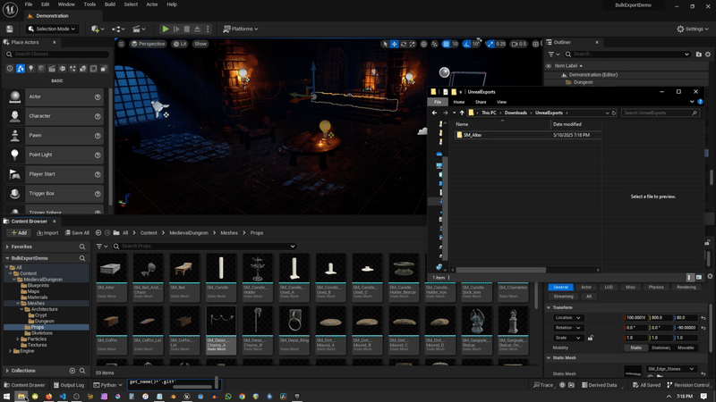 By default it is easily possible to bulk export Unreal Assets as .fbx Files, but with this script you can also export thousands of 3D Models using the very convenient file formats .glb and .gltf.